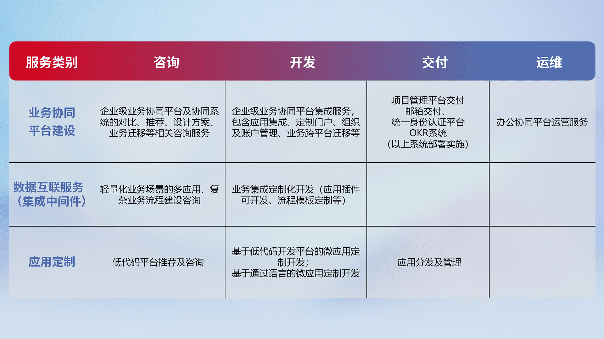 针对钉钉、、、、企微、、、、IDaas等平台级产品提供产品的规划、、方案、、、、交付、、、、定制化开发等服务,,,,实现如统一协同办公、、、、智能客户服务、、、、混合会议管理、、智能数据查询、、、、等业务场景,,,,实现数字化转型。。。。